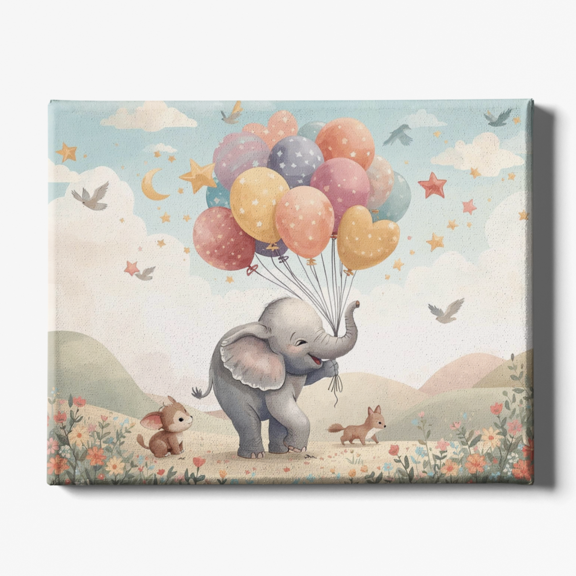 Step into a world of gentle magic with Parade of Dreams, a charming paint-by-numbers kit that captures a baby elephant holding a bouquet of floating balloons shaped like stars, moons, and hearts. Behind this sweet little parade, tiny woodland creatures join in, adding to the joyful celebration. Soft hills, fluffy clouds, and swaying flowers create a serene, dreamy backdrop.