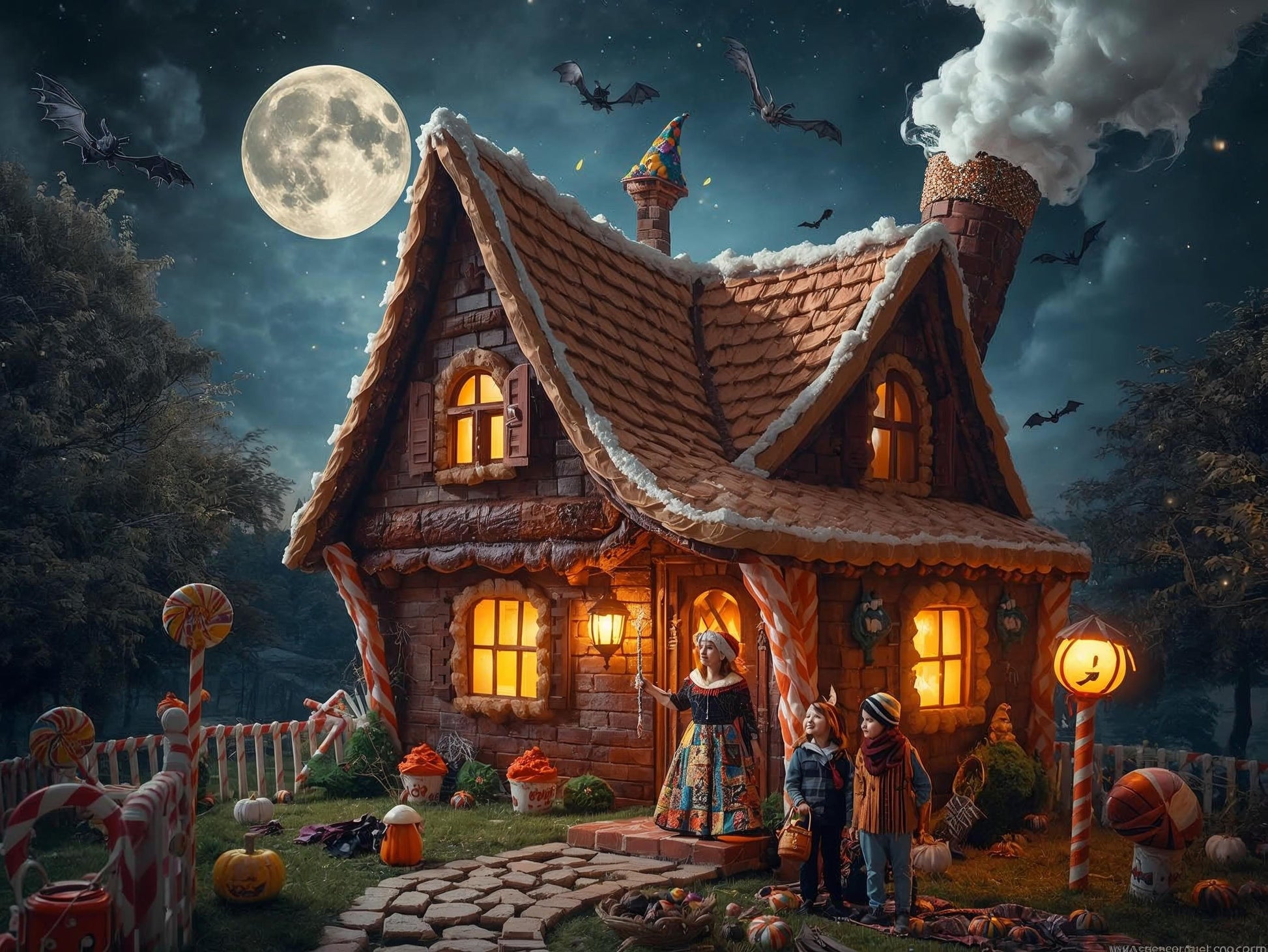 Step into a sugar-dusted dream with The Moonlit Candy Cottage — a magical Halloween night scene where sweets and spells swirl together beneath a glowing full moon. Nestled at the edge of a moonlit forest, this surreal, storybook-style cottage is handcrafted from gingerbread bricks, licorice beams, and chocolate mortar, with a crooked roof tiled in shimmering candy corn shingles.