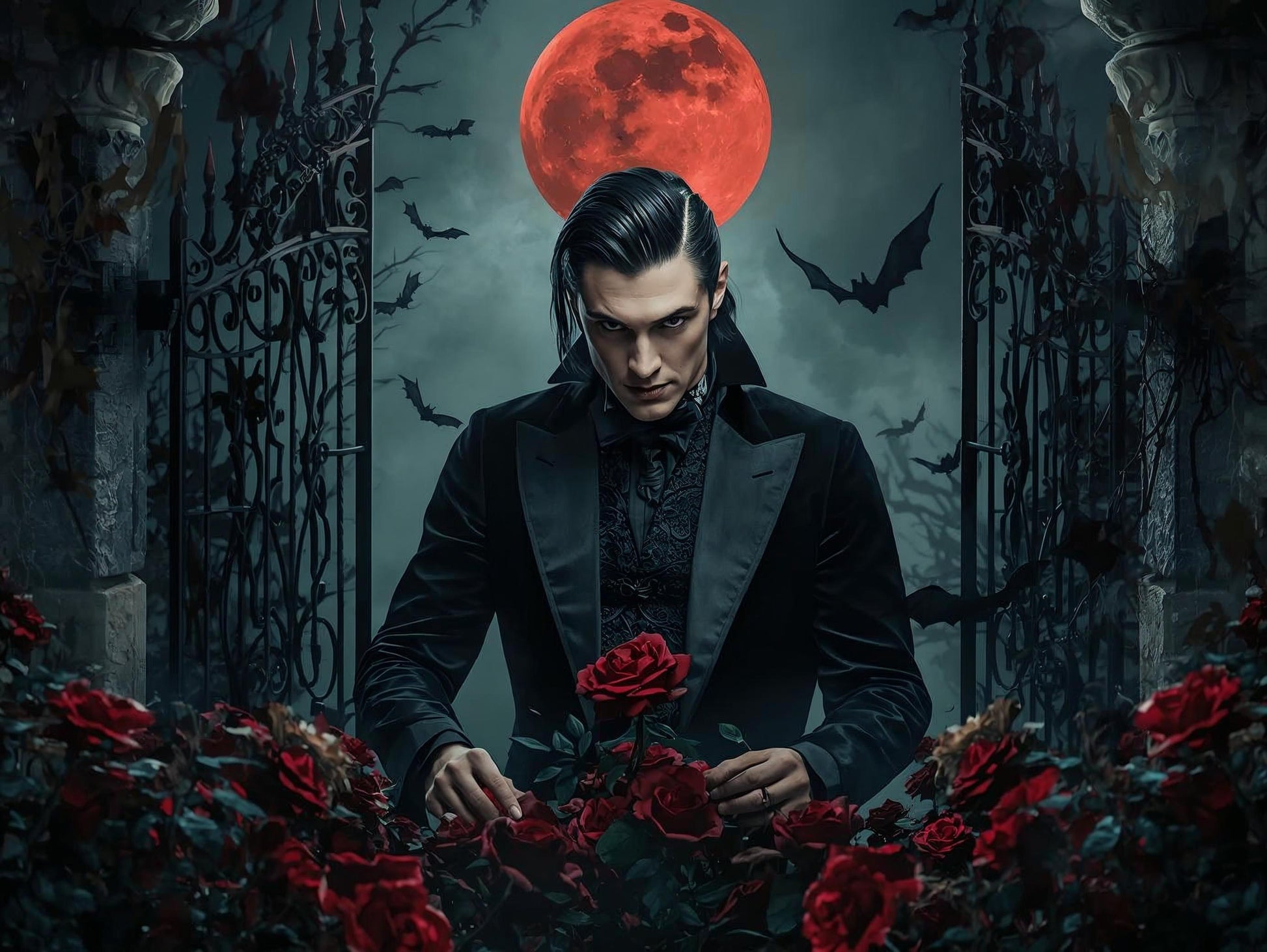 Dressed in opulent Victorian attire, his polished boots rooted among twisted vines, the vampire’s piercing gaze meets the viewer head-on, framed by a classic side-part hairstyle and sharp, chiseled features. Above him, a dramatic blood moon floods the scene in an eerie crimson glow, casting deep shadows across twisted iron gates where bats cling in silence.