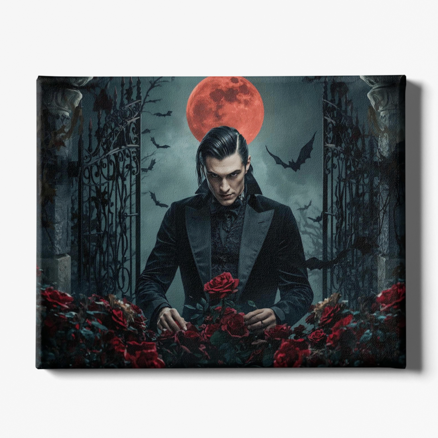 Rendered with a strong, stylized aesthetic, this piece is ideal for lovers of vampire lore, Victorian fantasy, and Halloween gothic décor.